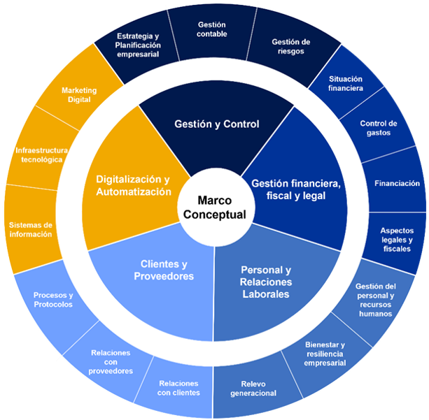 La herramienta se ha construido entorno a un marco conceptual estructurado y detallado que abarca múltiples dimensiones críticas de la gestión empresarial. Cada dimensión se desglosa en áreas específicas de estudio que reflejan los desafíos y necesidades particulares de las empresas en la región.